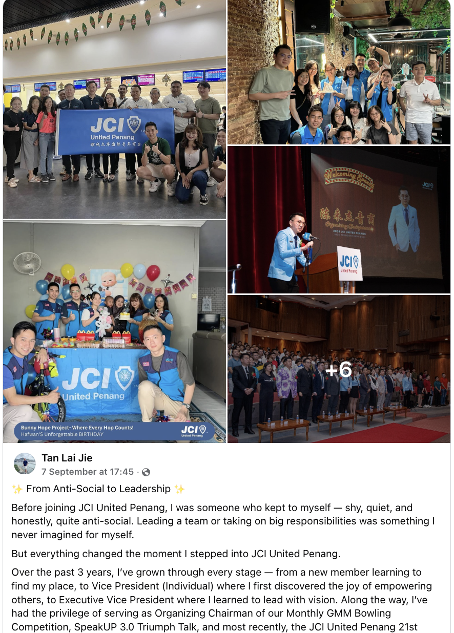 Whether you’re a fresh graduate, young professional or entrepreneur, JCI United Penang gives you a platform to grow: